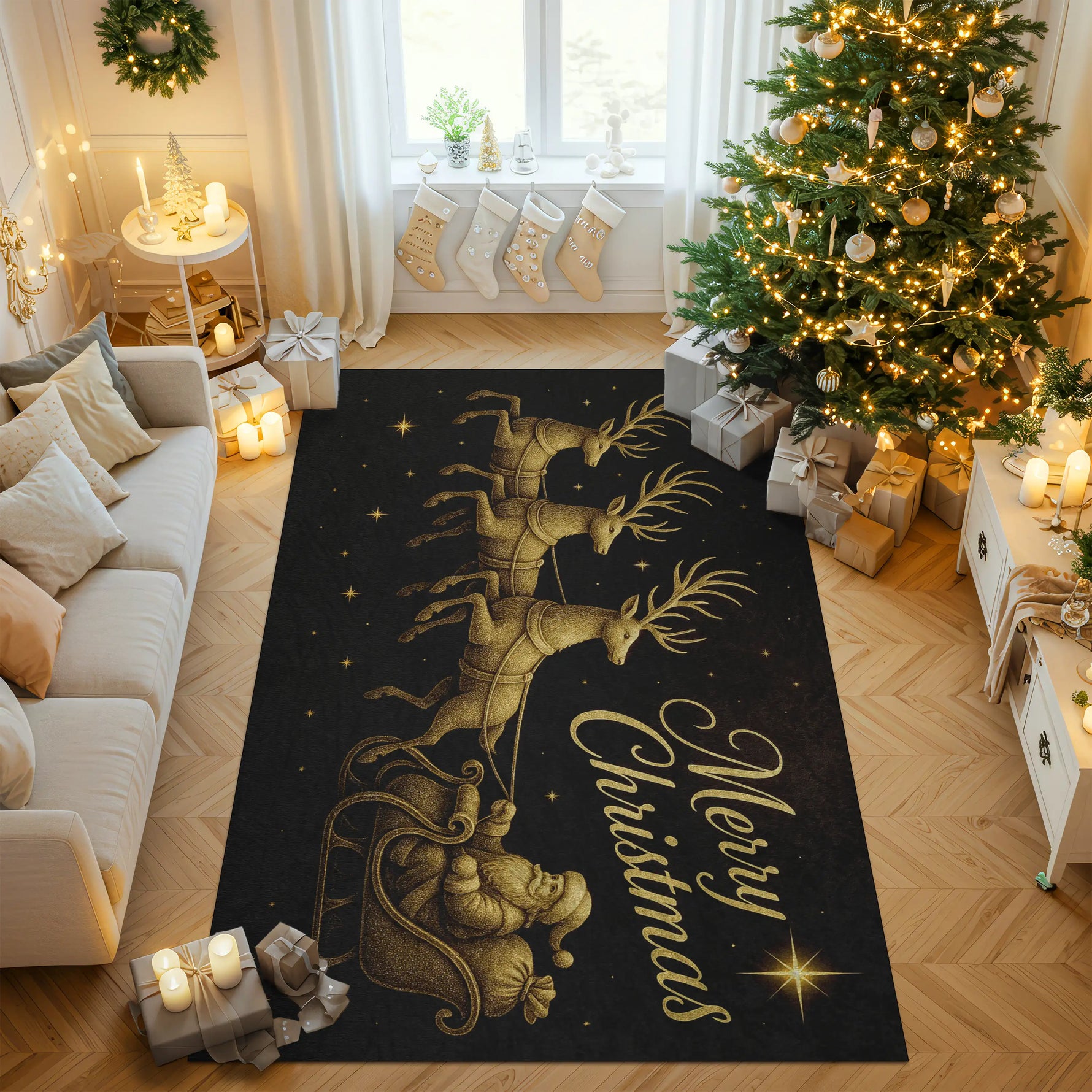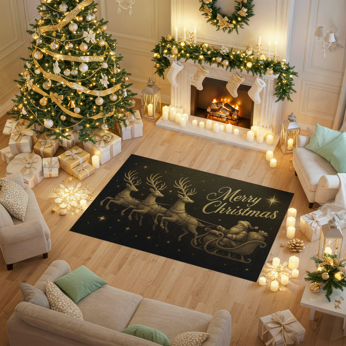 Gold Santa Sleigh & Reindeer Christmas Rug – Elegant Black Holiday Carpet