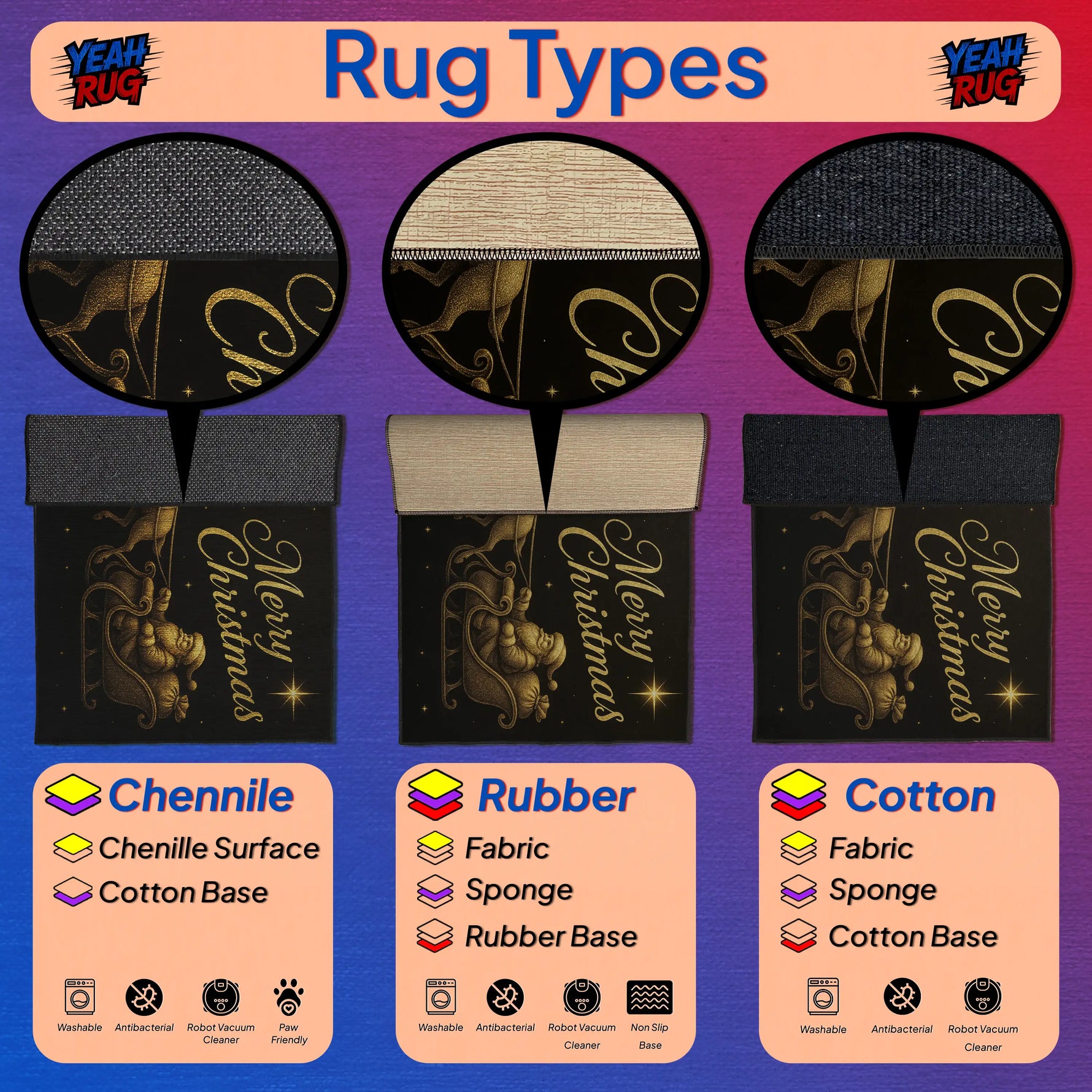 🧵 Premium build: Choose your texture — cotton base, rubber base (non-slip), or chenille surface for a soft holiday feel.